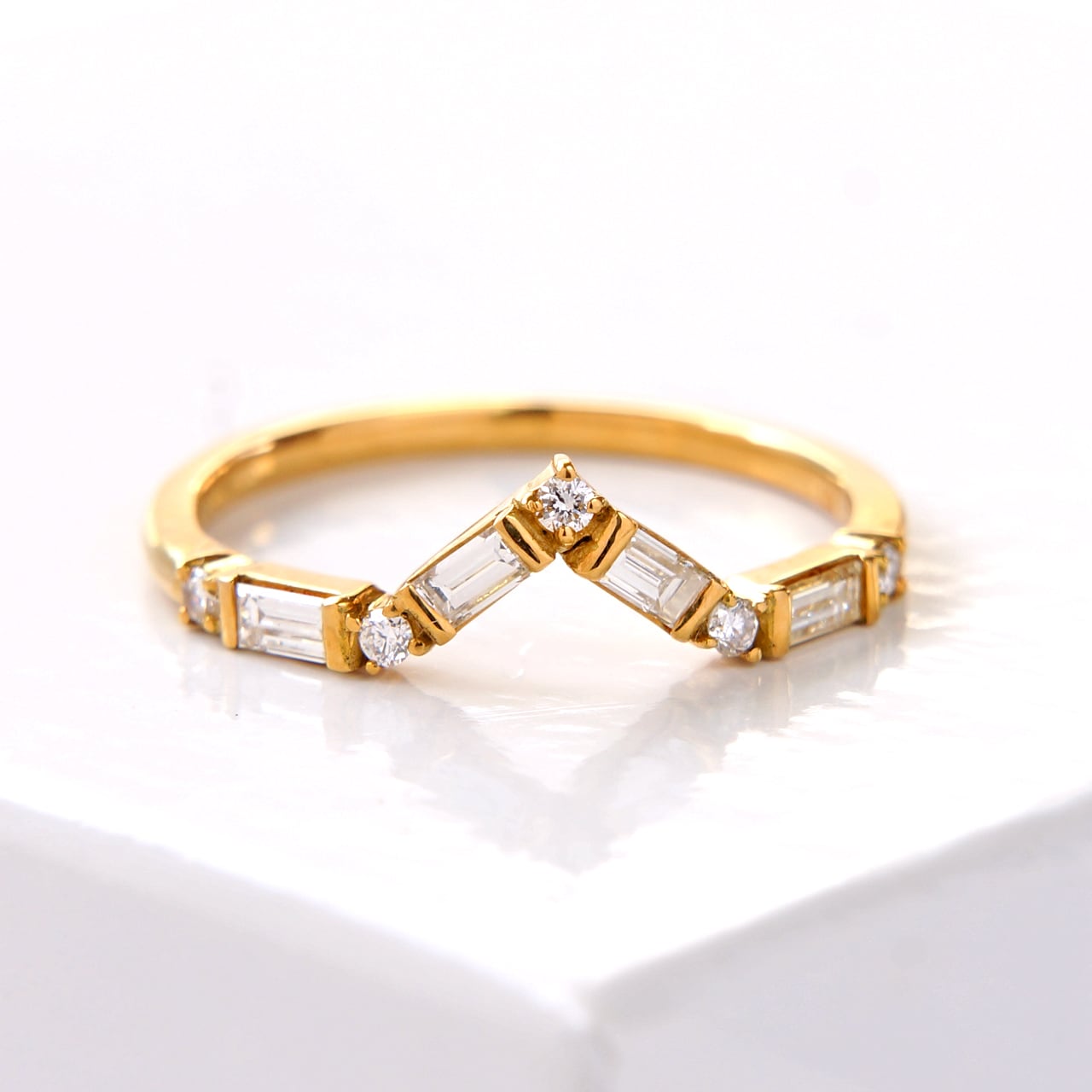 シンプルなV字型のリングにバケットとラウンドの2種類のダイアモンドをあしらい、上品に仕上げました。