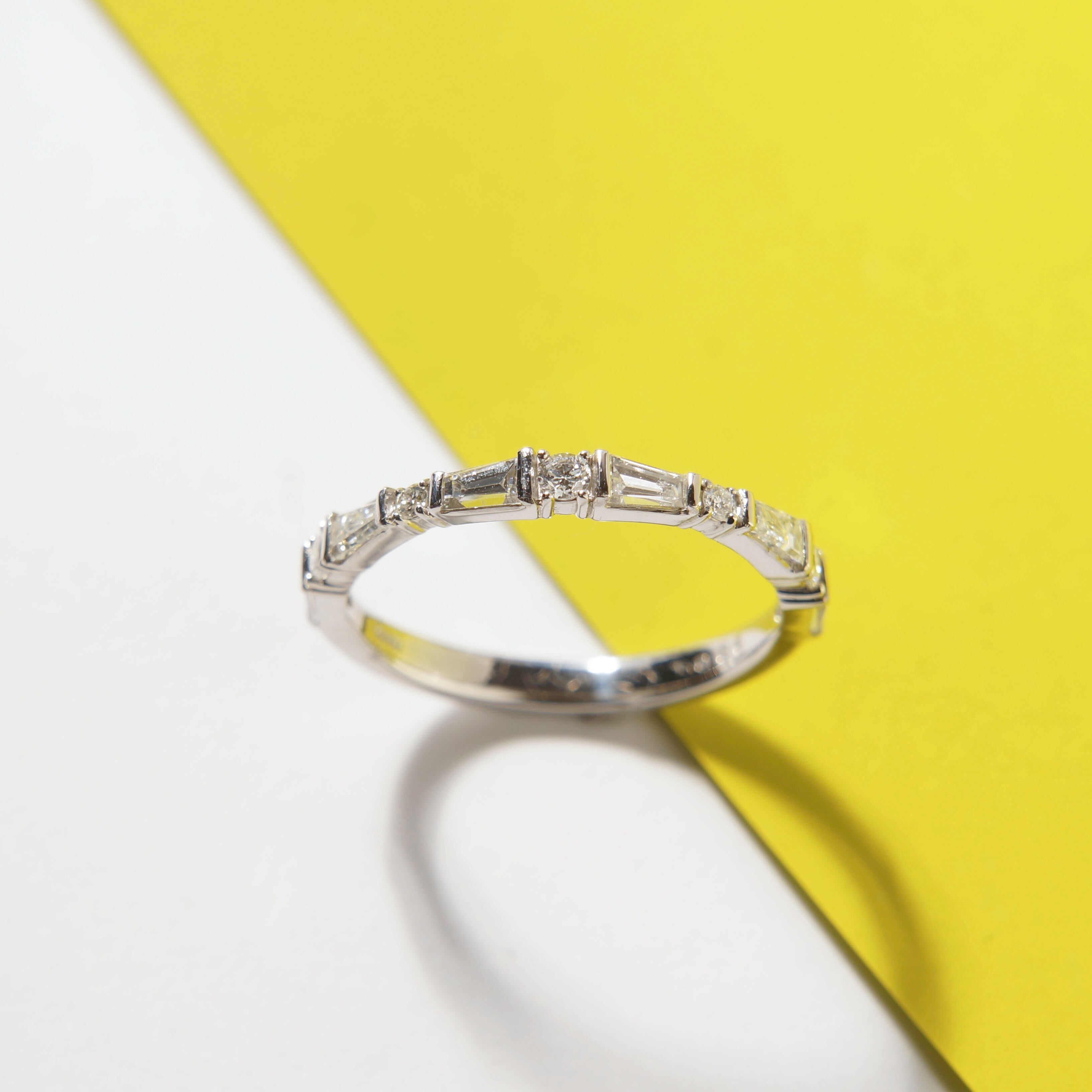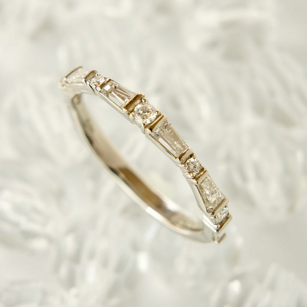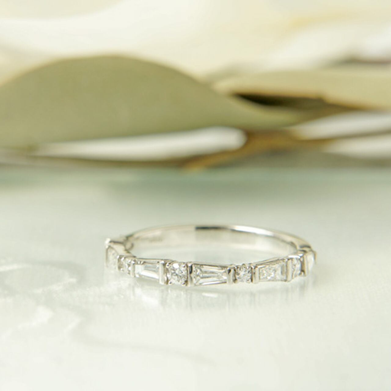 すっきりとした透明感のあるシャープな台形のテーパーカットとラウンドダイアモンドの組み合わせ。落ち着いた中にも品のあるシンプルなオリジナルデザインのリングです。