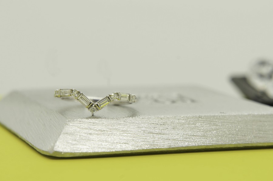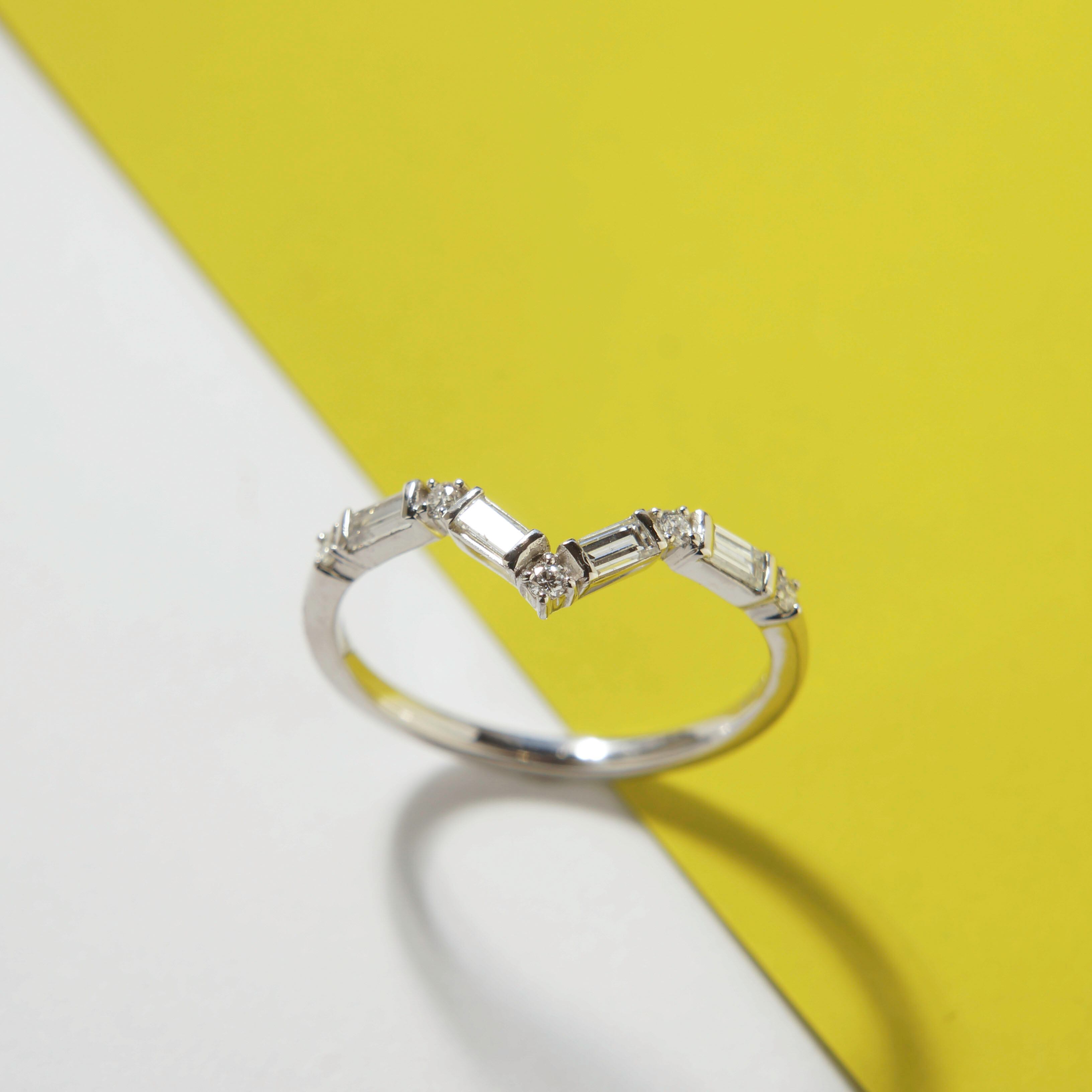 シンプルなV字型のリングにバケットとラウンドの2種類のダイアモンドをあしらい、上品に仕上げました。