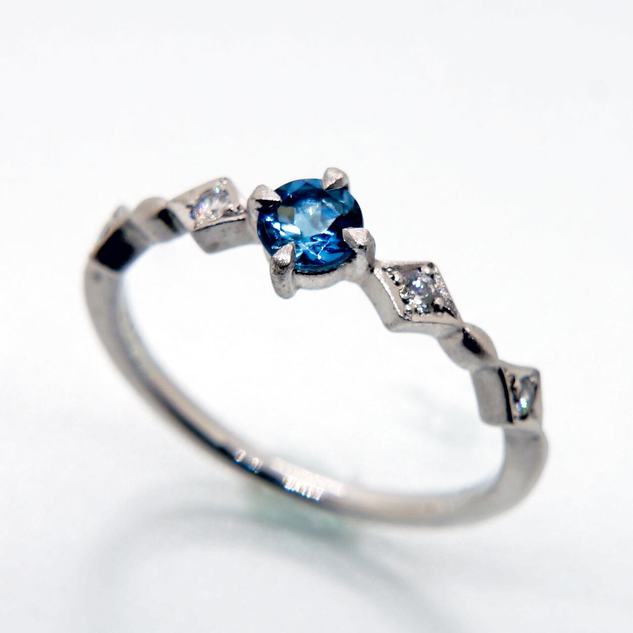 脇には、天然ダイアモンドを4石セッティングし、美しい海のようなサンタマリアカラーのアクアマリンを、引き立てております。国内の工房にて職人が丁寧に仕上げました。安心のMADE IN JAPANです。